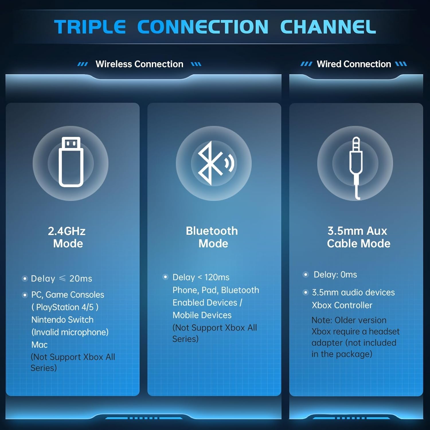 • 【3-in-1 Connectivity & Multi-platform Compatibility】The 2.4GHz mode of this ps5 headset wireless can be compatible with PS5, PS4, PC, switch, Mac, Laptop, Computer with the USB adapter (enabling seamless connectivity within 49ft). Bluetooth 5.3 mode of this ps5 headset with mic is compatible with Mobile phone, Tablet, iPad and other smart VR devices. In addition, the wireless gaming headset pc comes with an additional 3.5mm auxiliary cable for use with the Xbox One/X, S-Series, and other game controllers with a 3.5mm connector. (ALL Xbox Series ONLY Support Wired Mode)